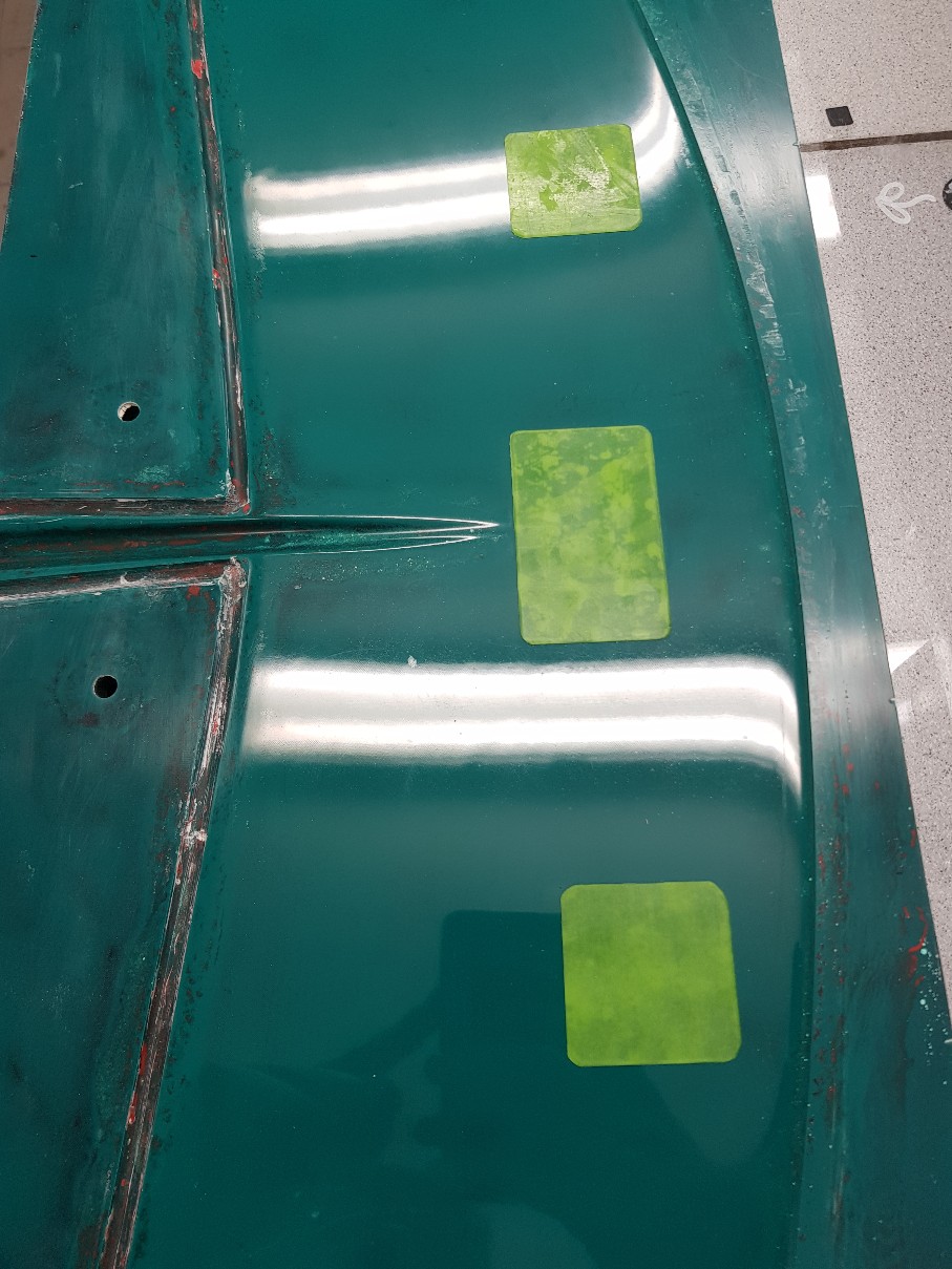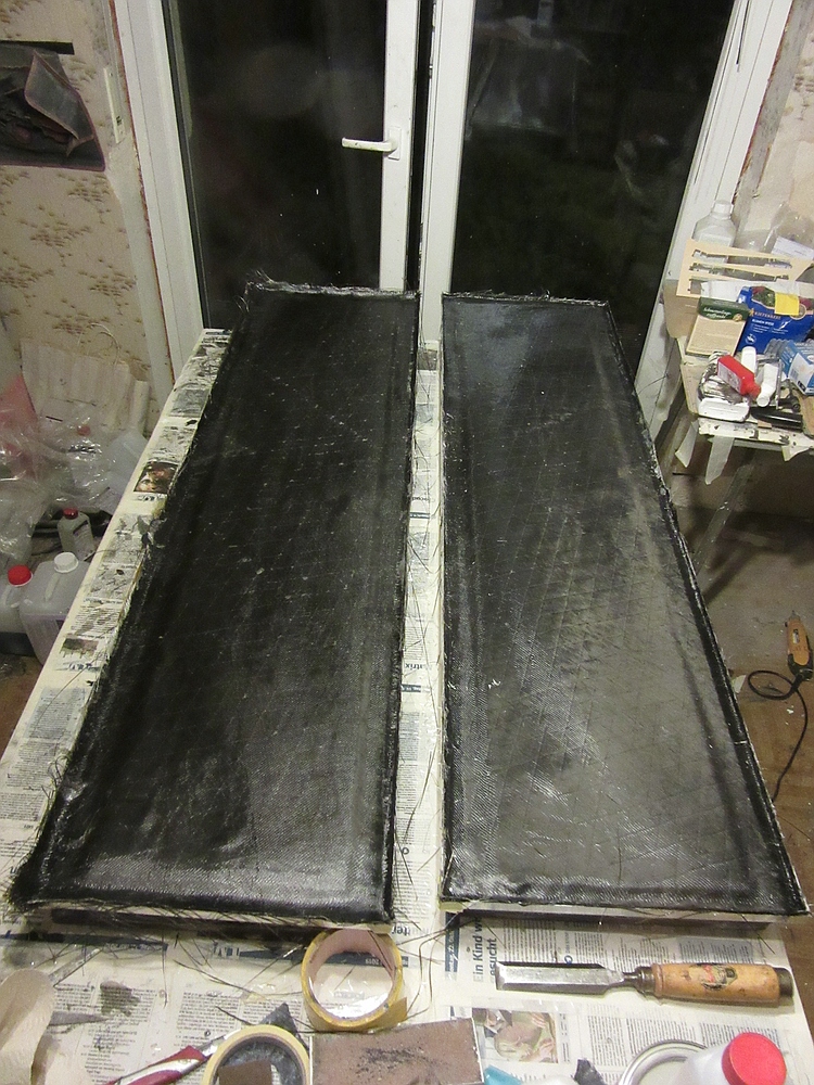 Damit liegen knapp 4,5 kg/m² Gewebe plus die Kork-Stützlage in der Formschale und das ist für die Flachform ohne Hinterfüllung in der Formgröße ca. 0,35 x 1,3 m nach meiner Meinung die Untergrenze. Man merkt beim fertig stellen der Formen wie sie sich beim hantieren biegen, zum bauen der Flügel müssen die Formen später beim aushärten auf einer ebenen Unterlage liegen um Verzüge auszuschließen.