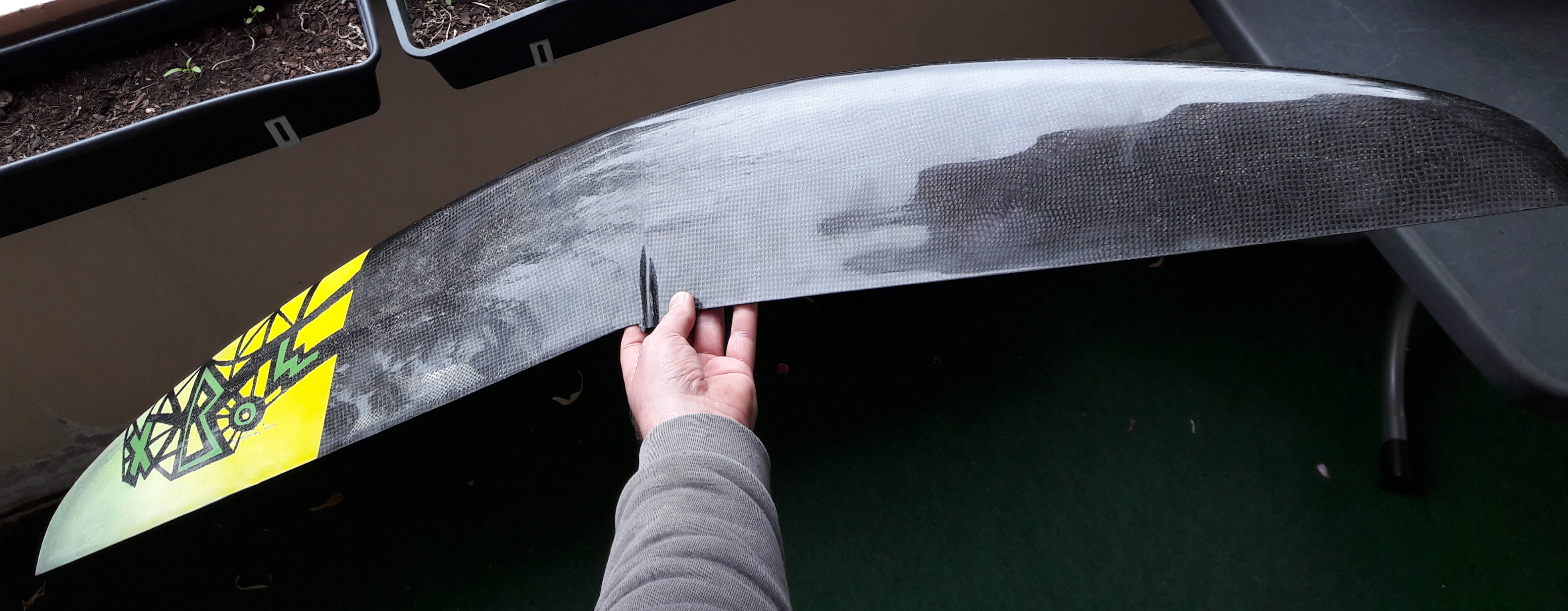 Als erstes habe ich eine Finne laminiert. Hartschale 25g Glas und irgendein rumliegendes Spreadtow Gewebe.