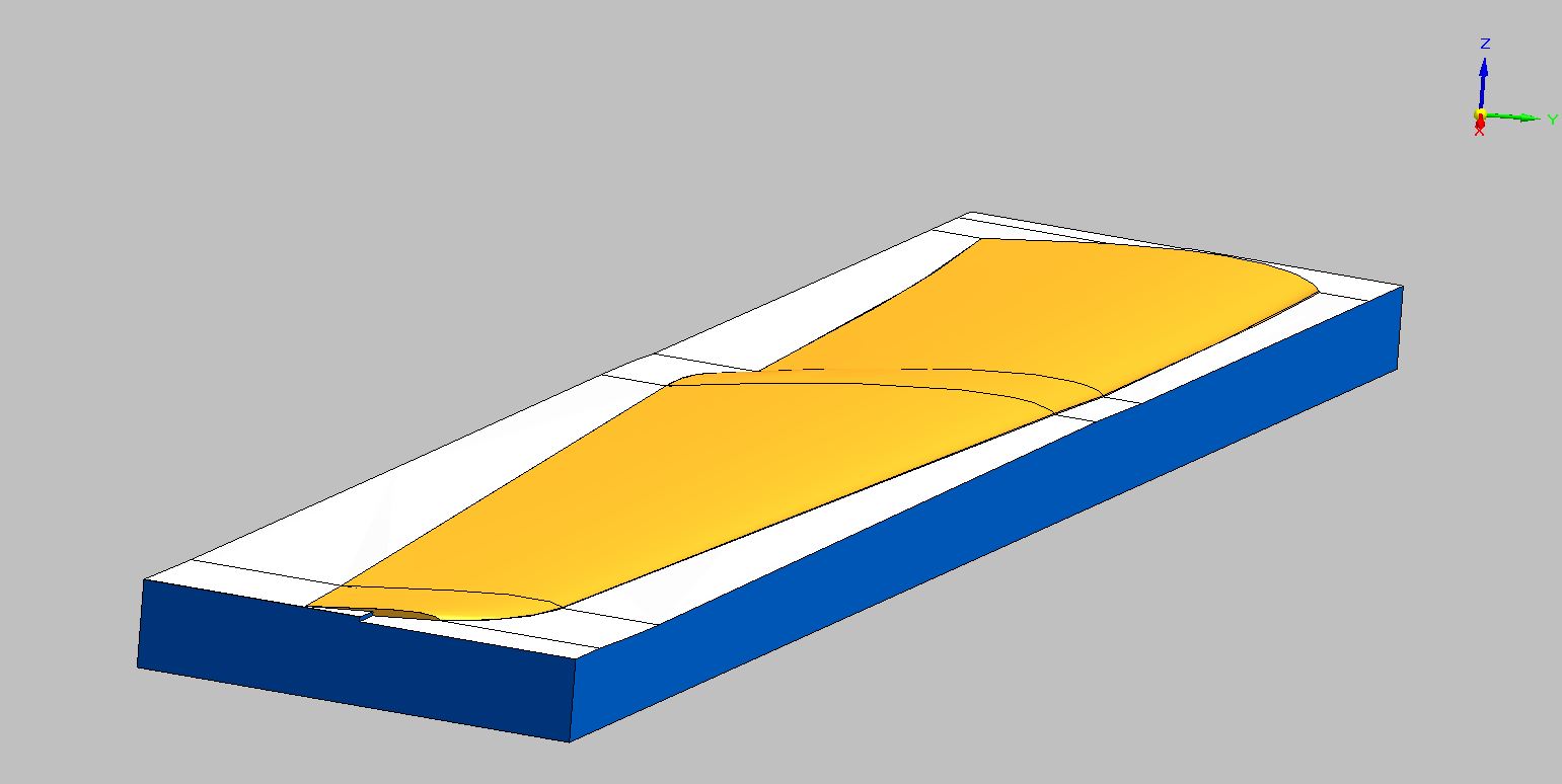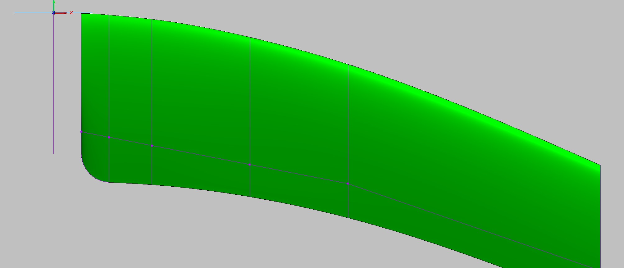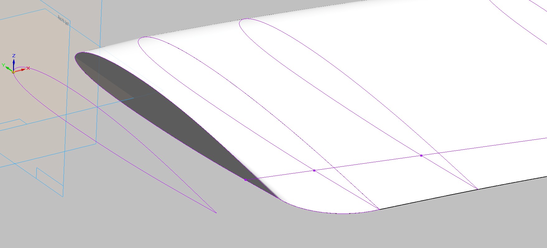 Gleichen muesste man fuer die Unterseite machen, dann Ober und Unterseite miteinander verschneiden dann ergibt sich eine neue gerundete Endleiste die ein ganz bischen abweicht, aber die Flächenübergänge sollten dann alle ganz exakt tangential sein.