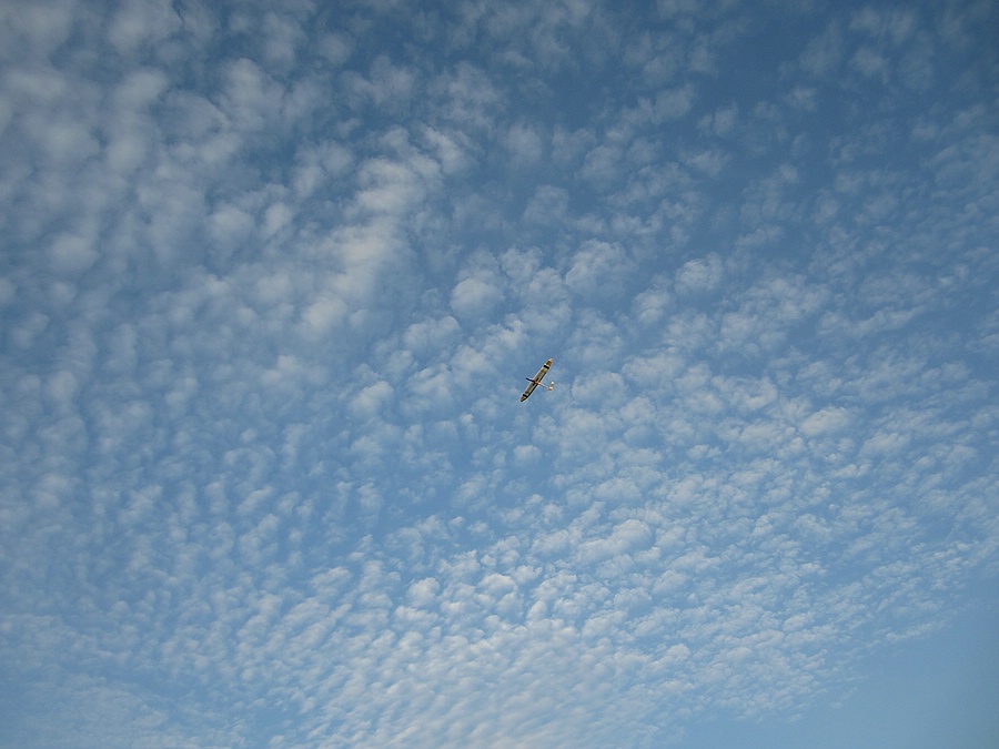 Leicht bedeckt mit zerfaserten langezogenen Wolken und Schäfchen. Nahezu Windstill. Höhenrekord erhöht 402 -> 409meter. Dann hat FrSky so deftig rumgepiept dass ich lieber die Klappen raus hab :( .