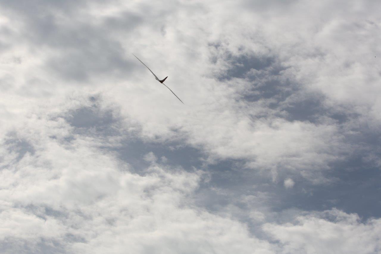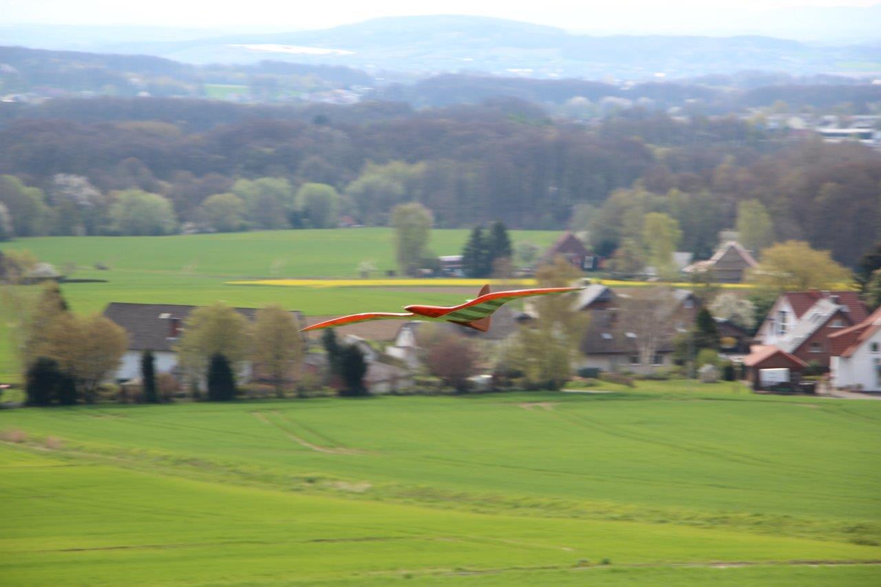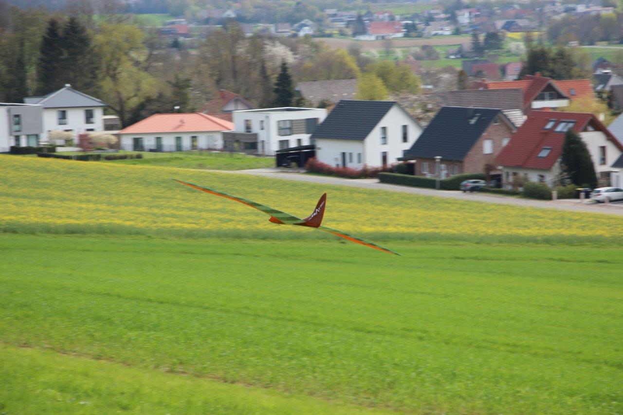 Flitschengummistart, der Rumpf ist ja anders nicht zu werfen, aber man hat gleich oderntlich Speed, das HR stand beim allerersten Flug noch 2mm zu tief, aber das war am Gummi kein Problem: