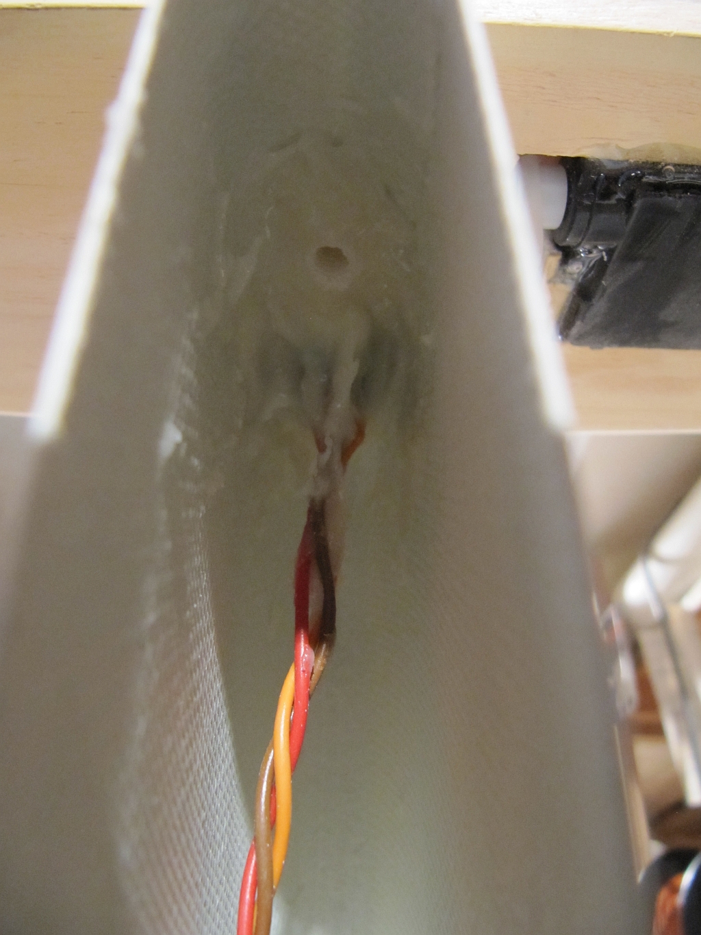 Habe das ganze jetzt mit einem Harz-Microballon-Gemisch gefüllt. Wenn das dann getrocknet ist wird die Stelle noch gespachtelt, geschliffen und wieder zu bespannt.