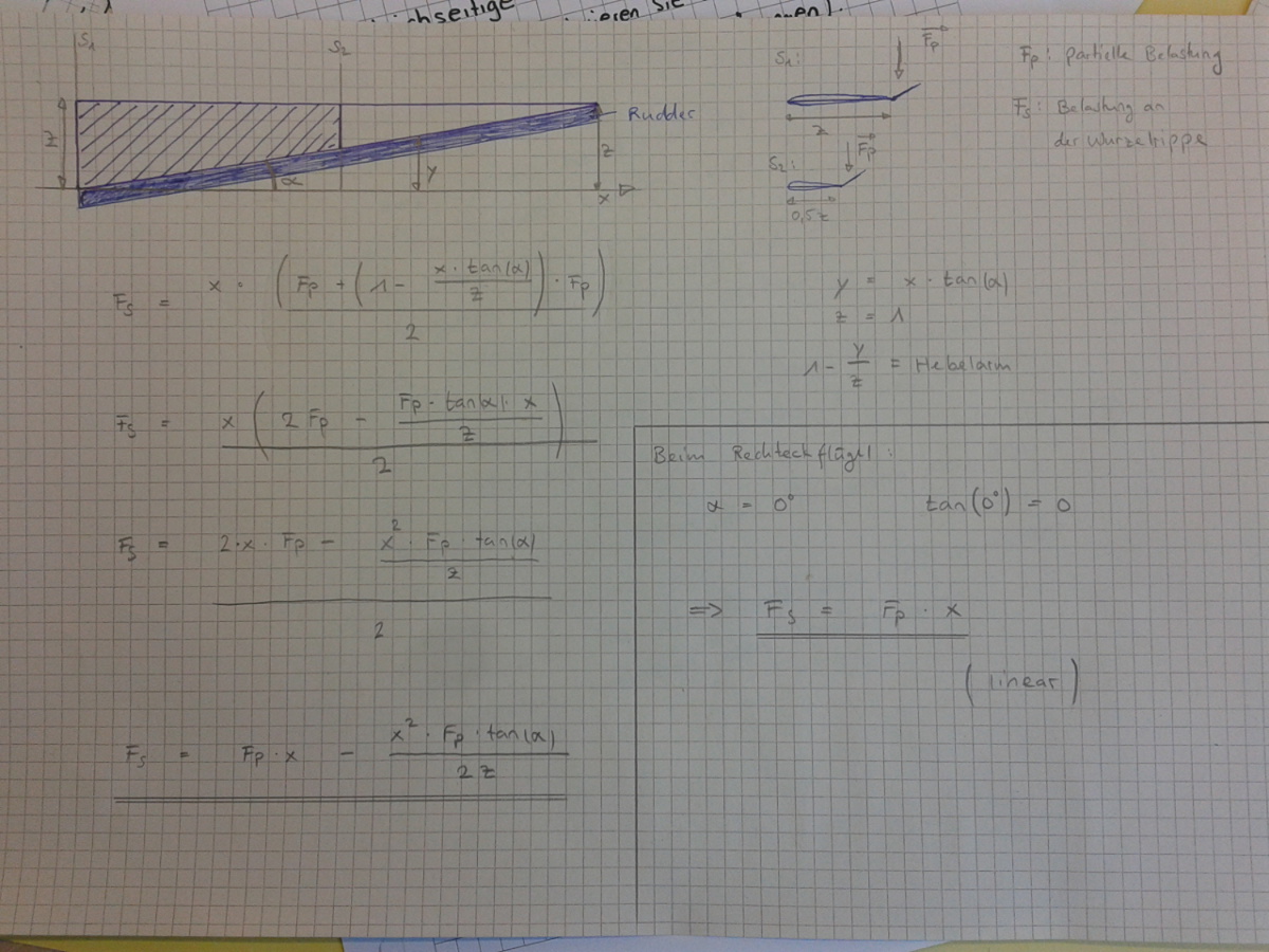 Nach meinem Verständnis kommen die Torsionsbelastungen doch eher durch das Profilmoment zustande. Da bei einem Querruderausschlag das Profil in seiner Wölbung verändert wird ( Ausschlag nach unten - mehr Auftrieb / Ausschlag nach oben - weniger Auftrieb ) ändert sich auch das Profilmoment und der Nullauftriebswinkel. Die Profilmomente dürfen nicht unterschätzt werden, sonst bräuchten wir ja nicht so lange Hebelarme, um das wieder auszugleichen ( Leitwerkshebel ) . Wenn man einen Flügel mit absolut elliptischer Auftriebsverteilung hernimmt ( lassen wir die Ruderausschläge mal außen vor ), dann kann ich mir gut vorstellen, dass Du recht hast, mit der exponentiellen Abnahme der Torsionskräfte. Denn wenn kein Auftrieb erzeugt wird, wirken wahrscheinlich auch keine Kräfte. Aber auch dann nehmen die Torsionskräfte erst ziemlich weit außen stark ab. Die Frage ist halt nur: Wieviel Flugzeit ( in Prozent) verbringen wir mit elliptischer Auftriebsverteilung - also ohne einen Ruderausschlag ??