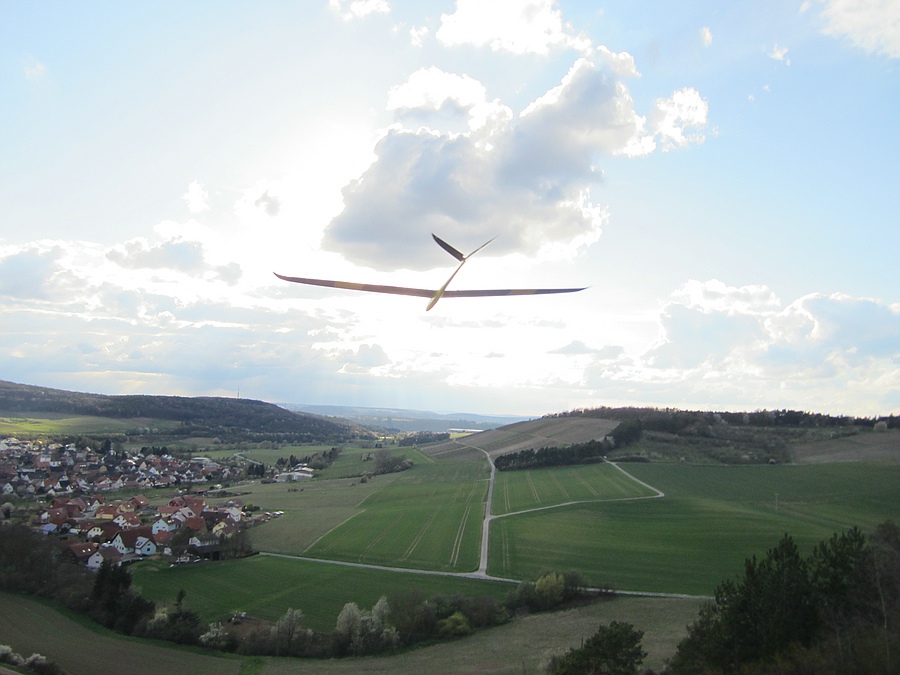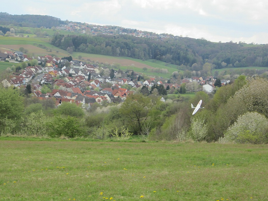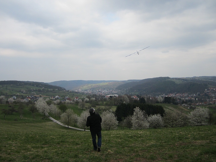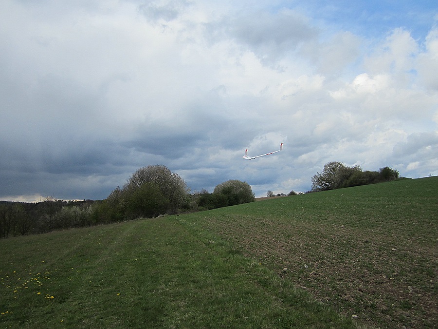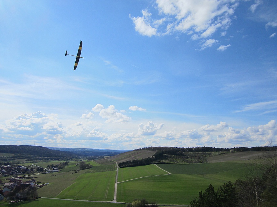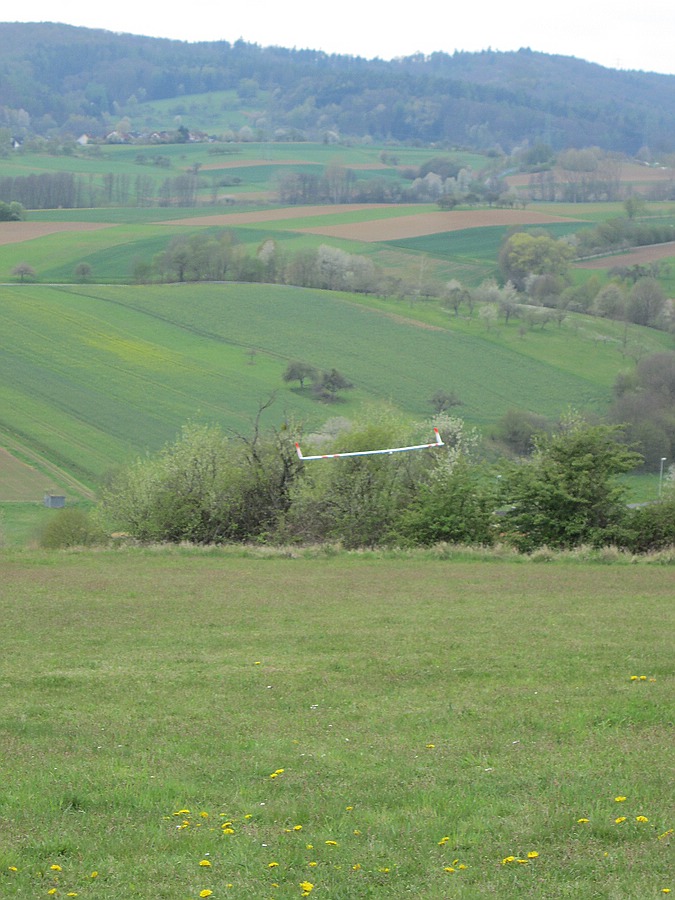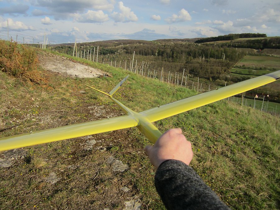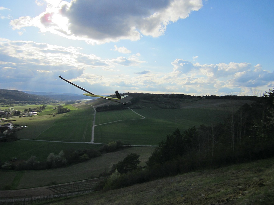 Heute war 2 Stunden vergnügliches Feierabendfliegen bei 2-3 Bft, in Böen 4 Bft, West-Südwest am Weinberghang angesagt, das leider auch nicht ganz bruchfrei verlief