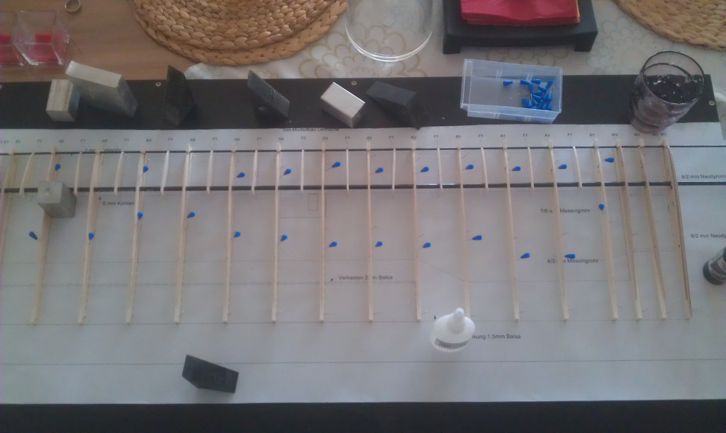 Als nächstes wurden die Rippen aus den Balsabrettchen gelöst und grob auf die Kohlerohre geschoben.
