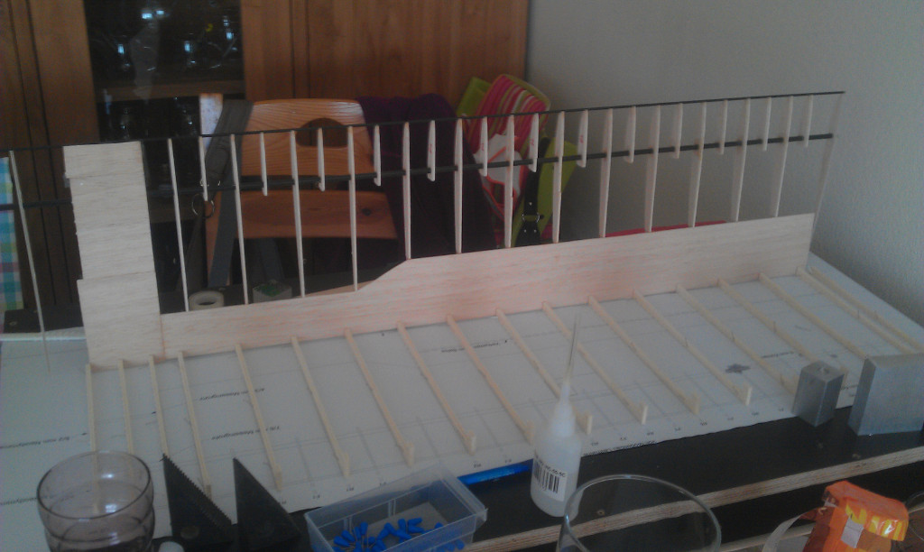 Danach wurde genau ausgerichtet und mit Sekundenkleber verklebt. Anschliessend habe ich die untere Beplankung zugeschnitten und mit dem Rippengebilde verklebt.