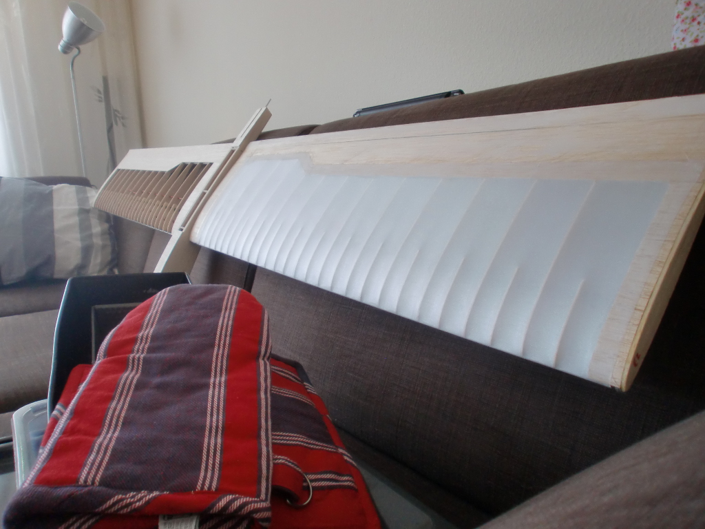 Jetzt muß eh erstmal alles zwei Tage durchtrocknen. Die zweite Fläche wird gerade beplankt. Wenn die dann trocken ist wird sie geschliffen und dann gleich mal alles an den Rumpf gesteckt.