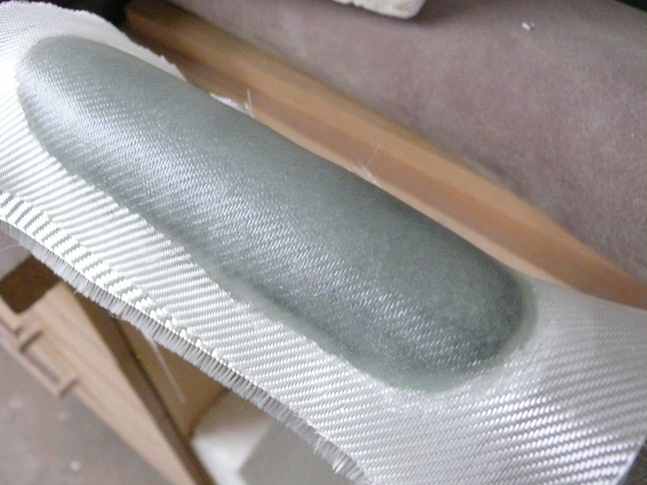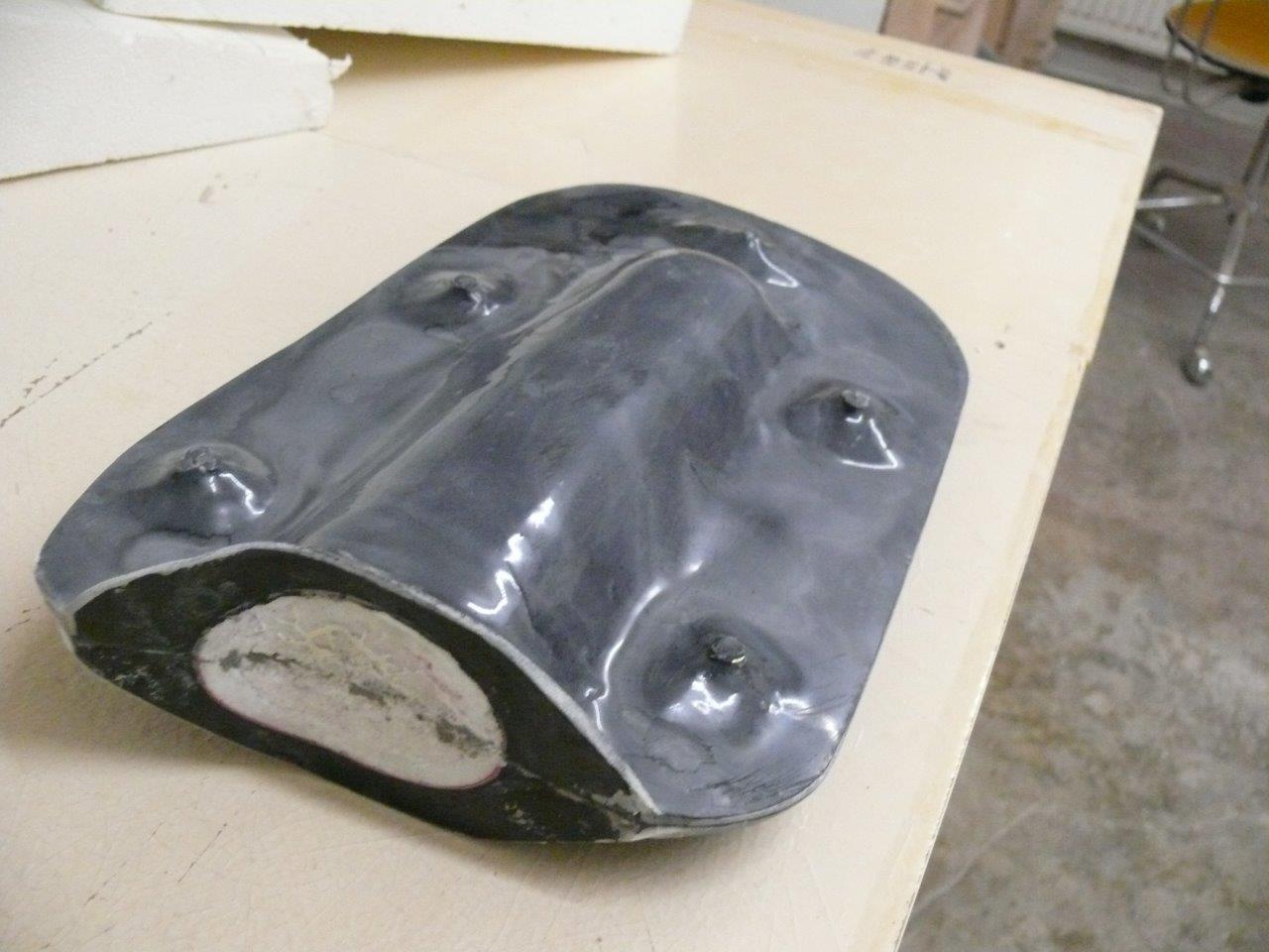 Ich laminiere in die Aussenform die geschlossen ist und ein bissel was dünnes auf den Stempel. Wenn das angeliert ist gebe ich etwas Harz mit Schaumtreibmittel in die Schnauze und drücke den Stempel rein.