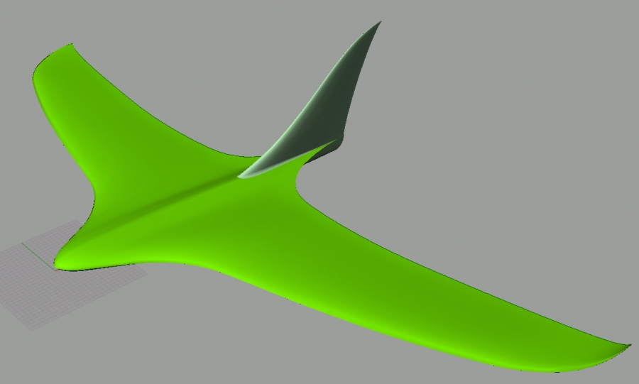 Die Recherche im Internet zeigte mir, dass es bereits ein paar solcher Konzepte gab. Besonderen Gefallen fand ich dabei am GIZMO von Tim Harris und dem MINIROCK, den ihr hier im Forum gebaut habt. Bei beiden Modellen handelt es sich um Entwürfe, die keinen ausgeprägten Rumpf haben, sondern bei denen der Rumpf quasi als tragendes Teil in die Fläche integriert ist. Dieses Konzept reduziert den Formenbau auf genau vier Formenteile: Ober- und Unterseite der Rumpf/Flächen-Kombi und linke- und rechte Seite des Leitwerks. Das Ganze jetzt noch auf maximal 1m Spannweite hingetrimmt und meine Rahmenbedingungen sind grundsätzlich erfüllt.