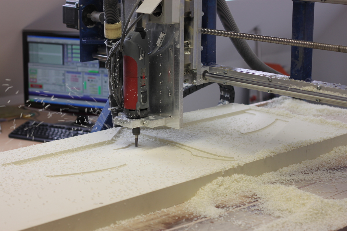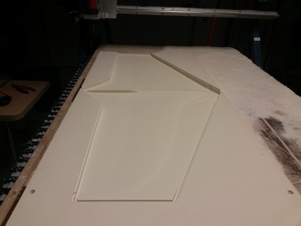 Nachdem das CAD-Modell soweit fertig gestellt war, konnten die Fräsarbeiten beginnen. Als Material kam das vorhandene Obomodulan 1000 zum Einsatz, welches ich allerdings nach den Erfahrungen beim Thor später lackiert habe. Die Fräsarbeit wurde dankenswerterweise von einem Modellflieger-Kollegen übernommen.