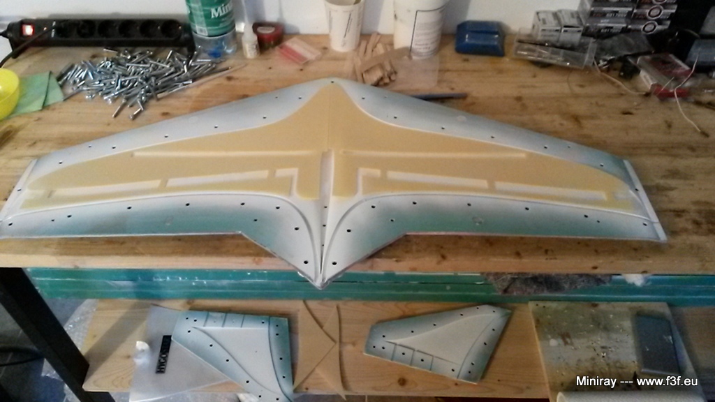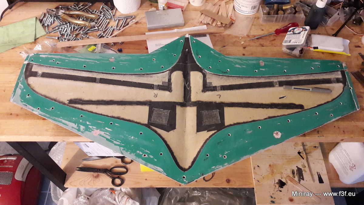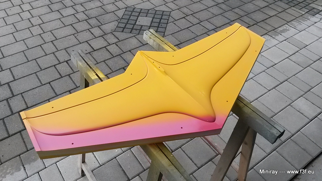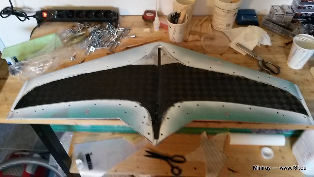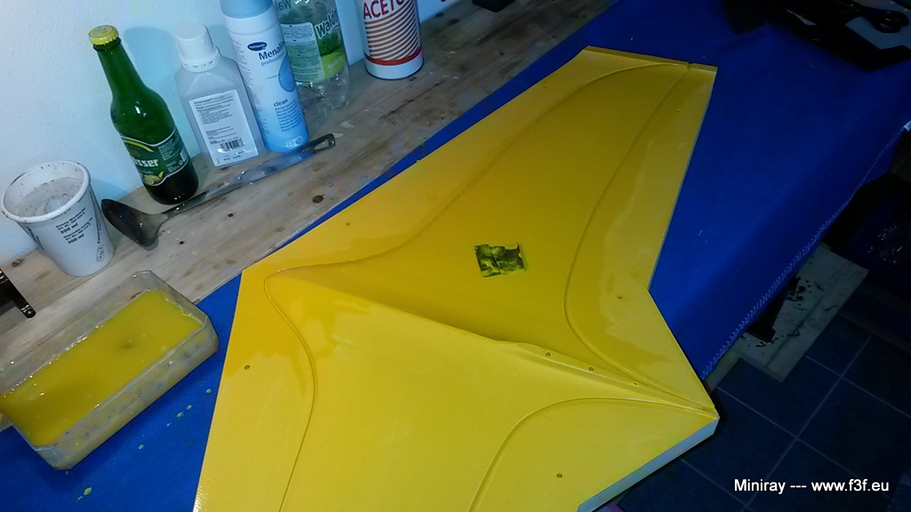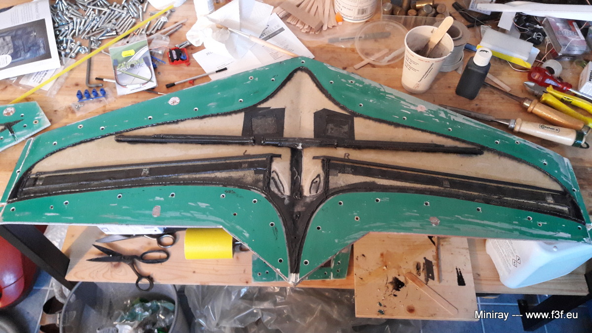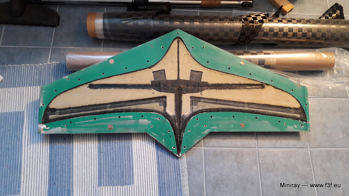 Dieser MiniRAY wird im Nasenbereich aus mehreren GFK-Lagen (zwecks 2G4) und im "Flächen"bereich mit 80er Spreadtow aufgebaut werden. Als Innenlage kommt ganzflächig 50er GFK zum Einsatz. Der Holmgurt wird mittels UMS-Gelege aufgebaut (3-2-1 100er Lage) und beim Scharnier kommen diagonal geschnittene Streifen aus Abreissgwebe zur Anwendung.