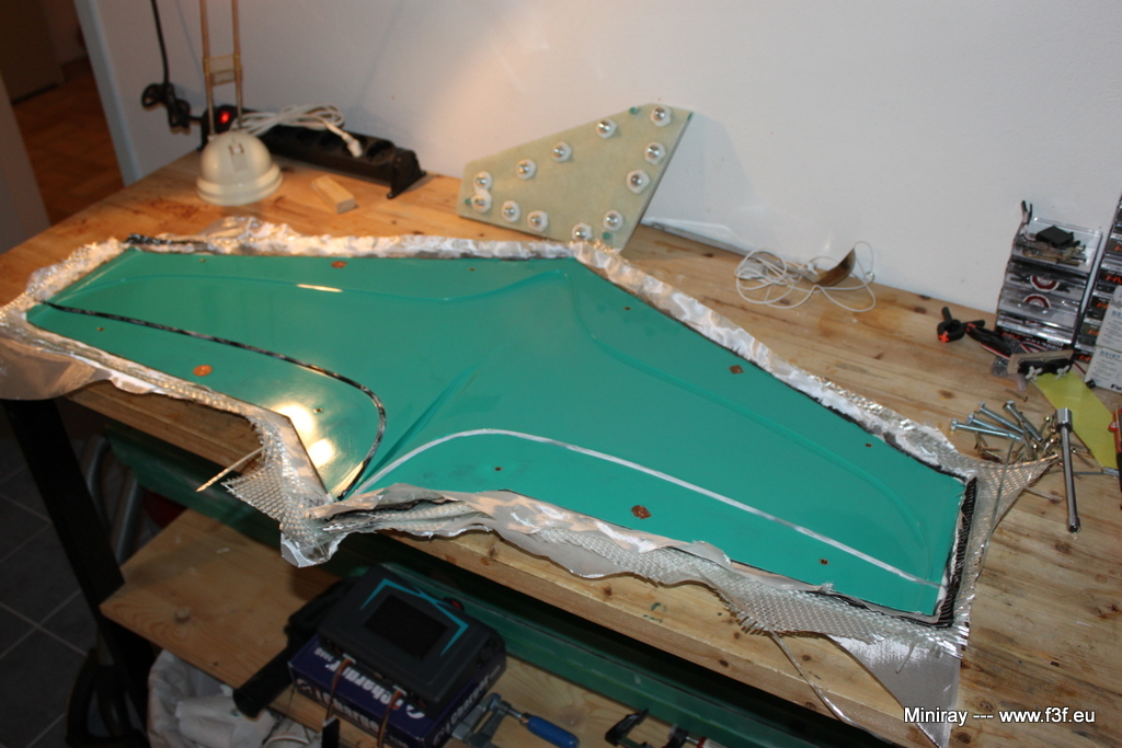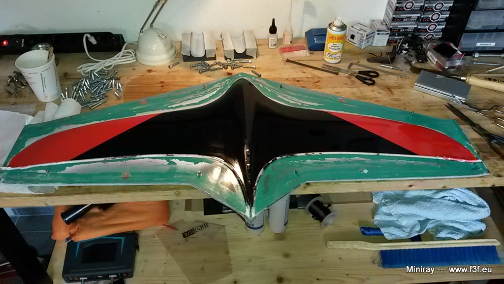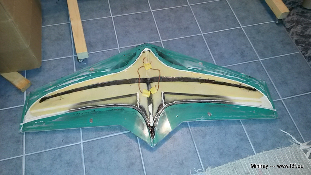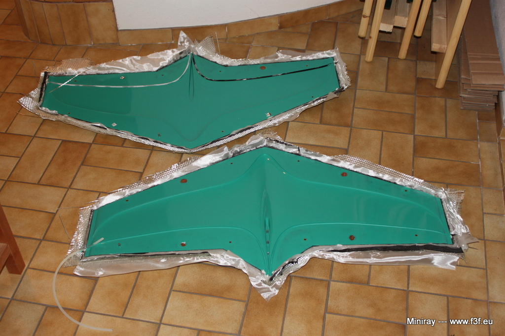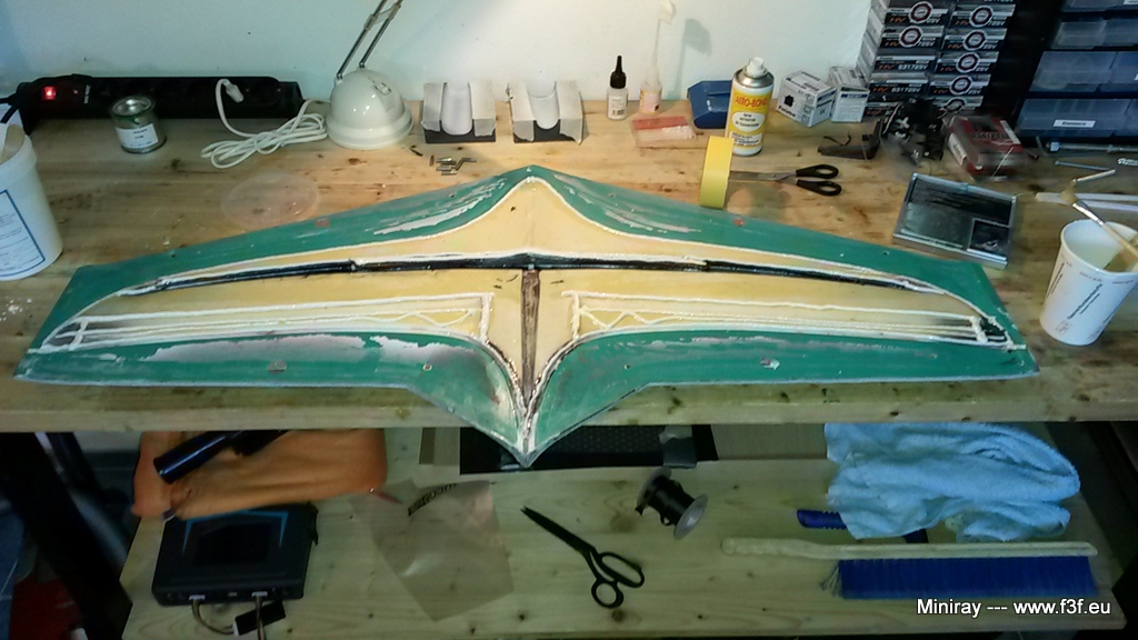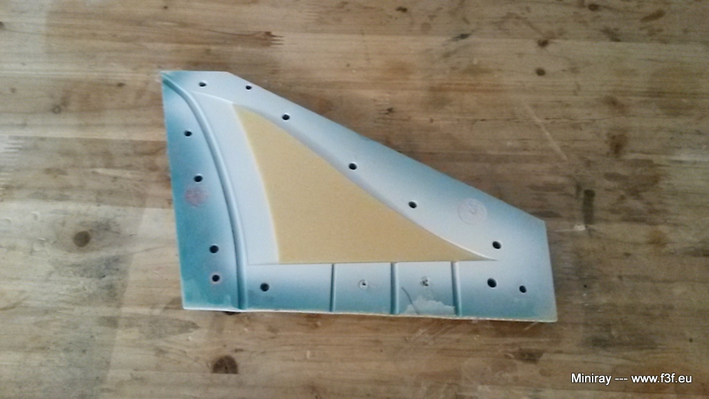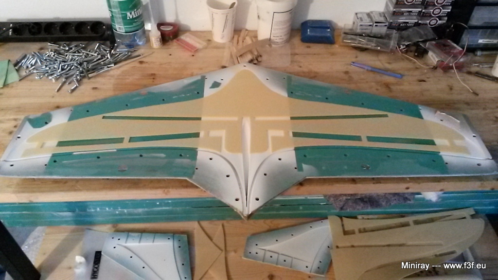 Dieser MiniRAY wird im Nasenbereich aus mehreren GFK-Lagen (zwecks 2G4) und im "Flächen"bereich mit 80er Spreadtow aufgebaut werden. Als Innenlage kommt ganzflächig 50er GFK zum Einsatz. Der Holmgurt wird mittels UMS-Gelege aufgebaut (3-2-1 100er Lage) und beim Scharnier kommen diagonal geschnittene Streifen aus Abreissgwebe zur Anwendung.