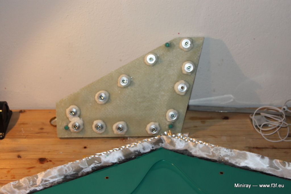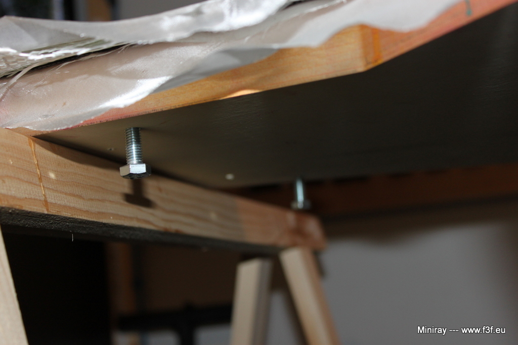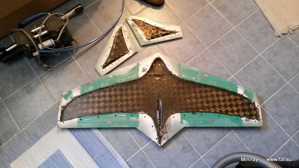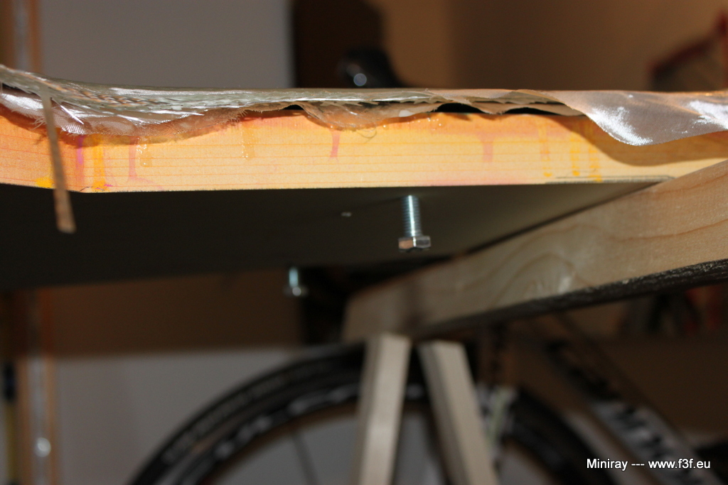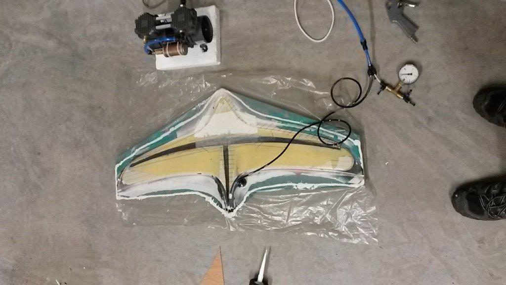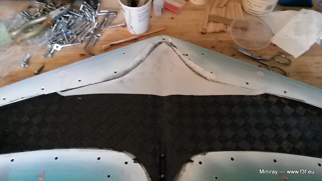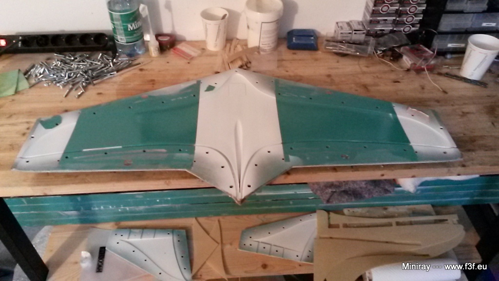 Dieser MiniRAY wird im Nasenbereich aus mehreren GFK-Lagen (zwecks 2G4) und im "Flächen"bereich mit 80er Spreadtow aufgebaut werden. Als Innenlage kommt ganzflächig 50er GFK zum Einsatz. Der Holmgurt wird mittels UMS-Gelege aufgebaut (3-2-1 100er Lage) und beim Scharnier kommen diagonal geschnittene Streifen aus Abreissgwebe zur Anwendung.