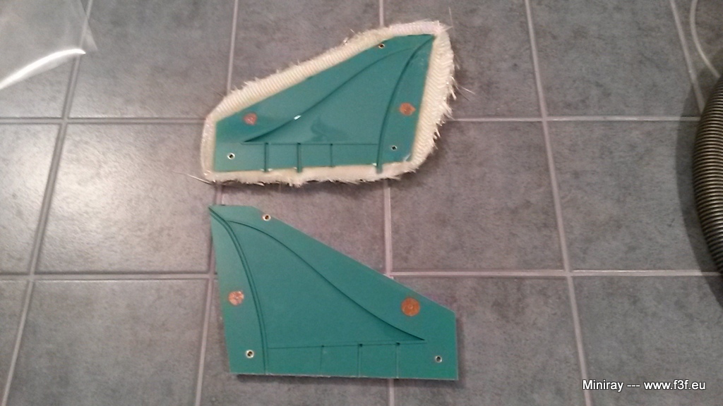 Eigentlich wollte ich heute den zweiten MiniRAY absaugen. Leider musste ich etwas länger im Büro verweilen, als geplant. Deshalb wird erst am Samstag vormittag abgesaugt. Immerhin konnte ich heute dennoch einige Vorbereitungen treffen, wie das Fräsen und Niederschleifen der Kanten des Stützstoffes und Gewebezuschnitte. Einlackiert habe ich die Formen bereits vor zwei Wochen mit UP-Vorgelat und ganz simpler Lackierung in Weiß, Orange und Transparent (für Sichtkohle).