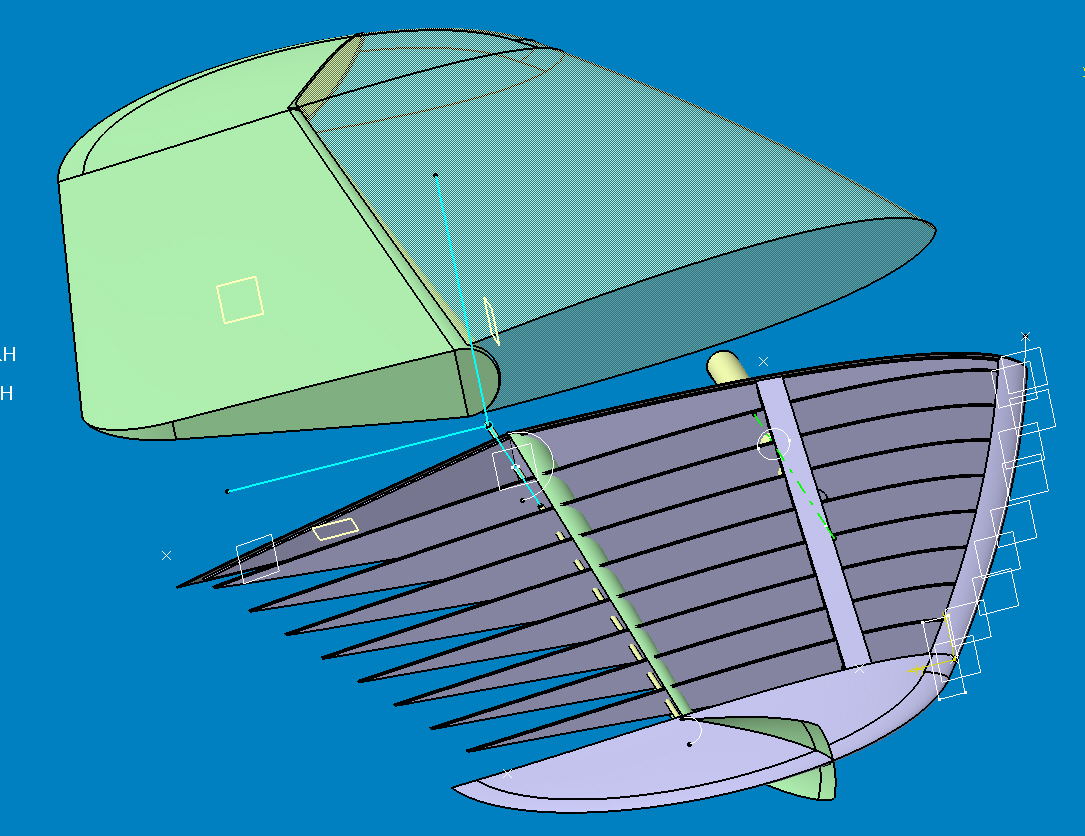Die Form die beim Verschleifen entstehen muss ist eine Art Zigarrenform, im Randbogen trichtergleich und da wäre es natürlcih von Vorteil die Rippen als Schleifanschlag zu haben um die Form exakt rauszubringen, dann gibt es für das Ruder nur keine Nasenleiste (durchgehend) sondern nur so eine Art Verkastungsstücke. Das restliche Leitwerk kann ja hinten "weiter offen sein" also benötigt nicht genau die negative Zigarre aber trotzdem geschlossener Kasten wegen Torsion.