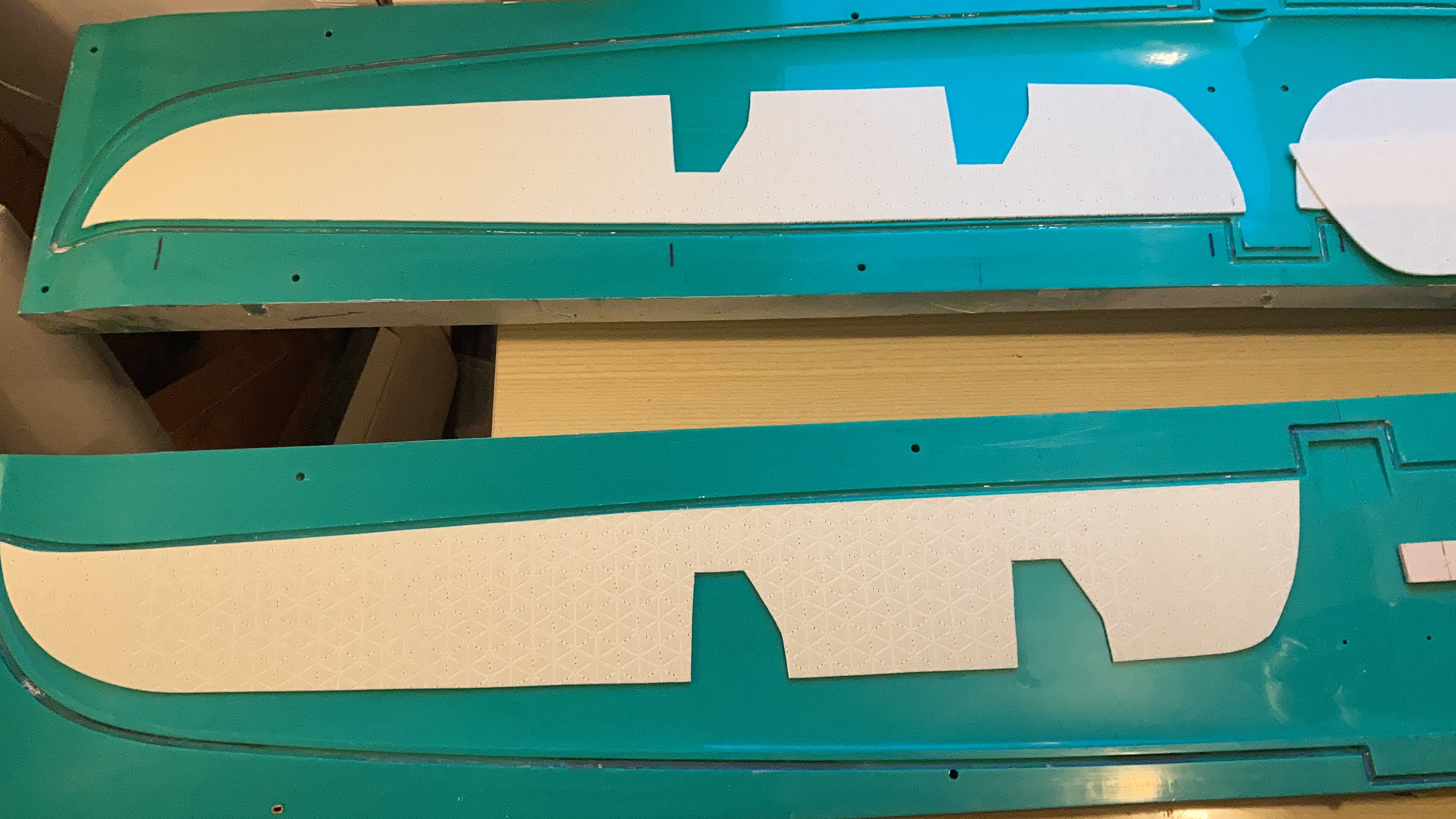 - Stützstoff ab Holm bis ins Querruder hinten bündig zur Form abschließen oder wenige mm nach vorne setzten? Die Schablonen sagen mir ca. 2mm vor dem Ende der Form. Stützstoff schleifen muss ich in beiden Fällen. Meine Überlegung ist bündig da ich so eine Harzrinne hinten an der Kante vom Stützstoff vermeide die ich sonst wieder mitbschleifen muss. Richtig?!?