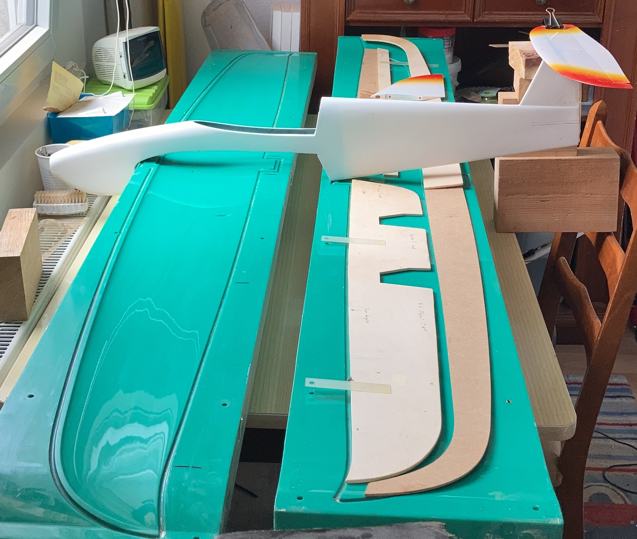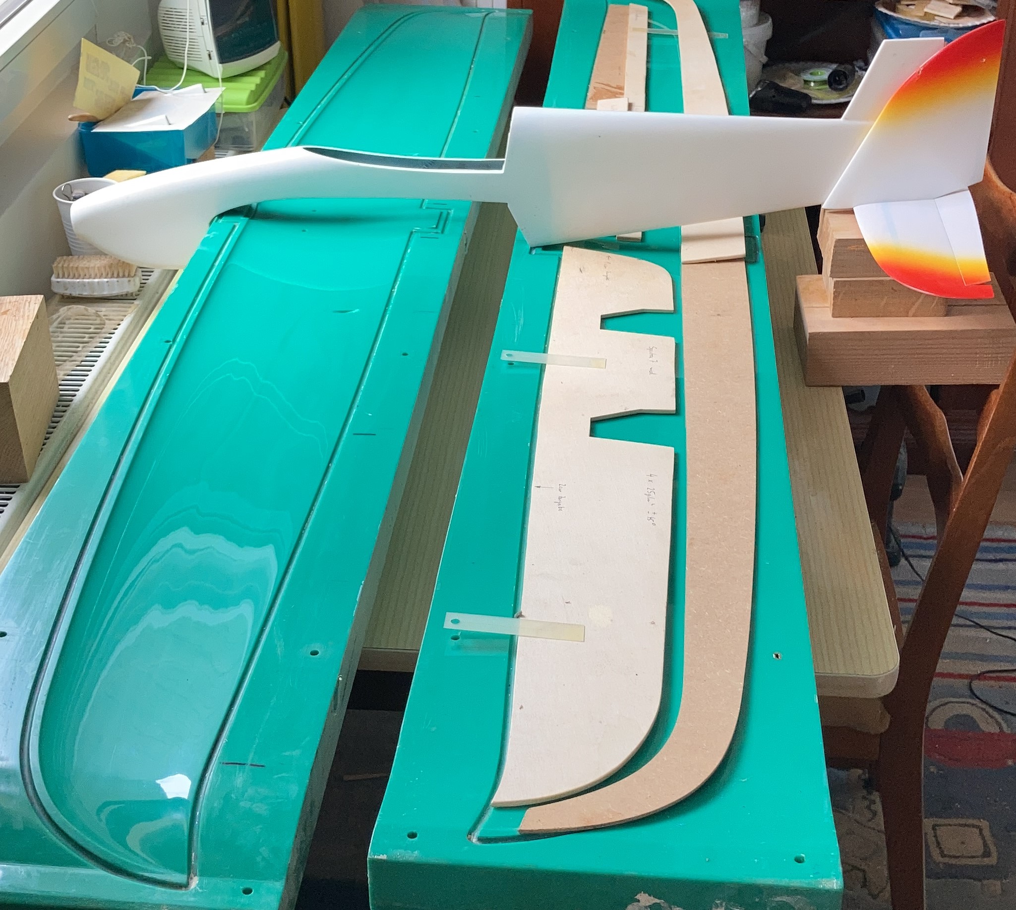 nun ist es passiert, eine Specter7 / GOONE 3 Flächenform mit allen Schablonen ist mir auf den Bautisch geflattert. Soll eine Fläche für ein Hangsegler werden. Nachdem ich nicht die Erfahrung habe im Flächenbau (das wird mein 6ter Flügel aus einer Form) brauche ich ein paar Infos zu den Details: