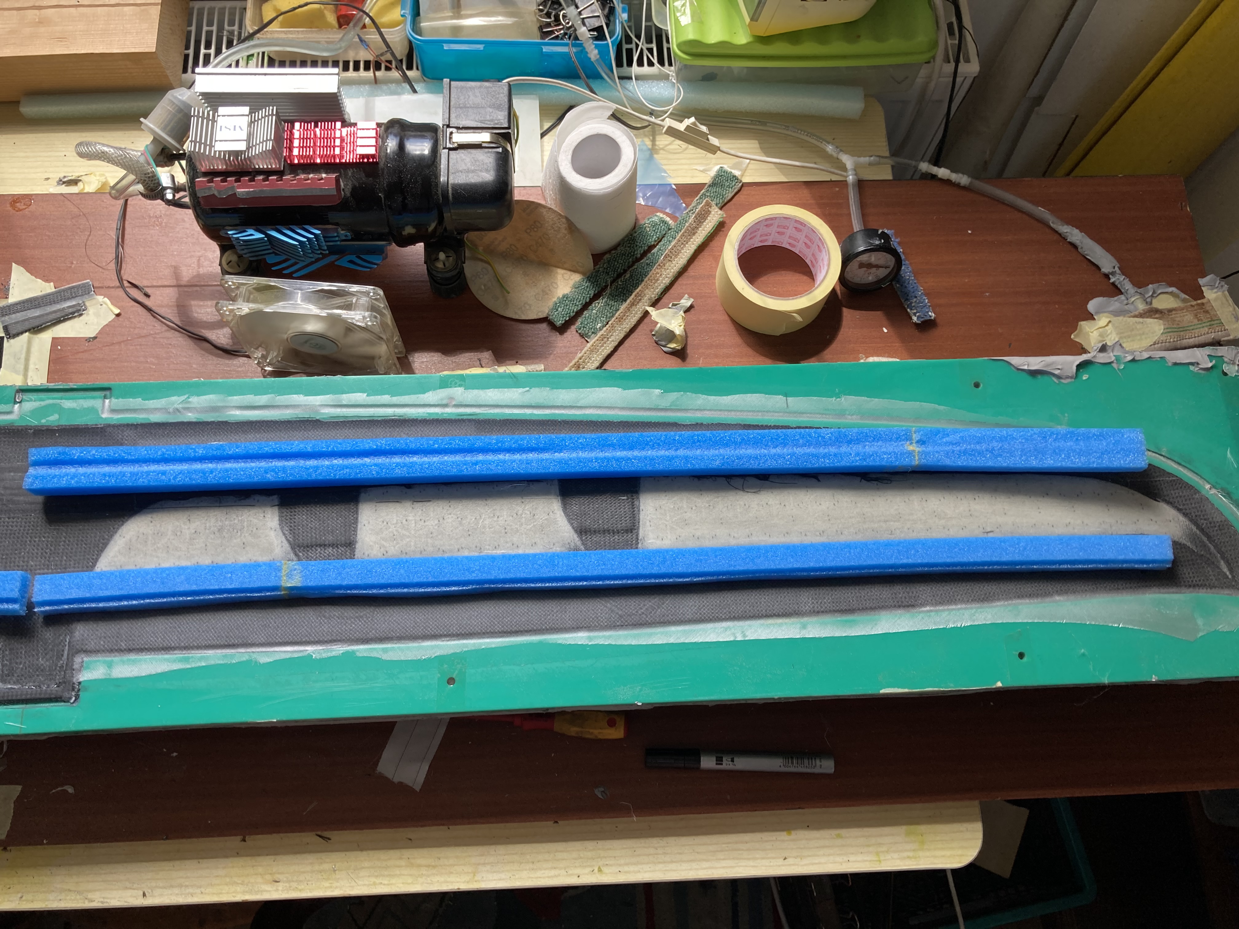 - Die Anlenkungen verschwinden in kleinen "Hubbeln" die direkt in die Form gefräst wurden. Wie bekomme ich da das Gewebe vernünftig angedrückt? Vom Raketenwurm 1 kenne ich vom Holmverbinder (Brücke) in der Mitte der Fläche die "Schwammtechnik" um saubere Kanten zu bekommen. Also Gewebe, Lochfolie, Abreisgewebe, wenig Klopapier (soll ja nicht alles Harz wieder raus ziehen), Folie, einen entsprechend großes Stück Spülschwamm und dann weiter bis der Sack zu ist. Vielleicht noch einen Streifen Malerkrep drüber zum Fixieren.