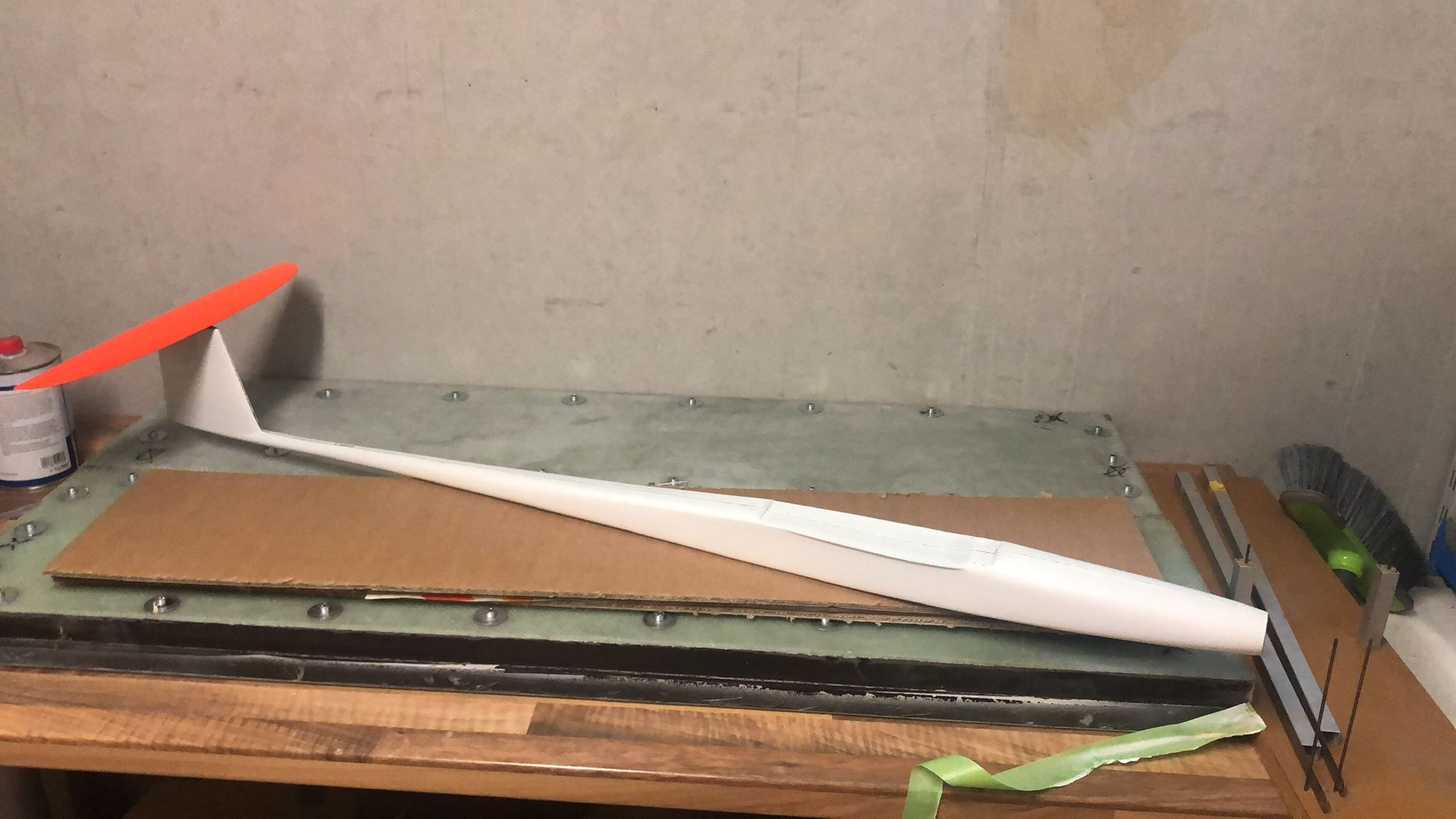 Heute durfte der Rumpf vor dem Flächenbau schon mal mit Spinner Probe liegen. Sieht ganz geschmeidig aus. Finde ich.