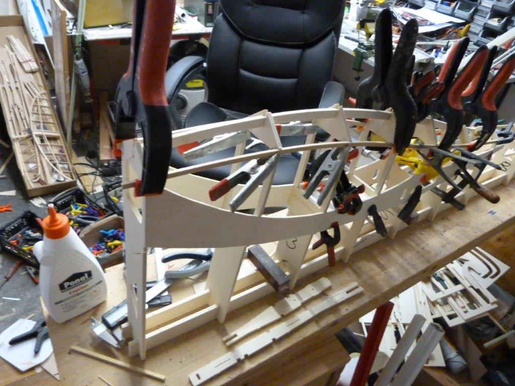 Den hinteren Rumpf habe ich auf den Gurten horizontal oben und unten ausgesteift. Der Bereich war beim Prototyp etwas weich. Jetzt nicht mehr.
