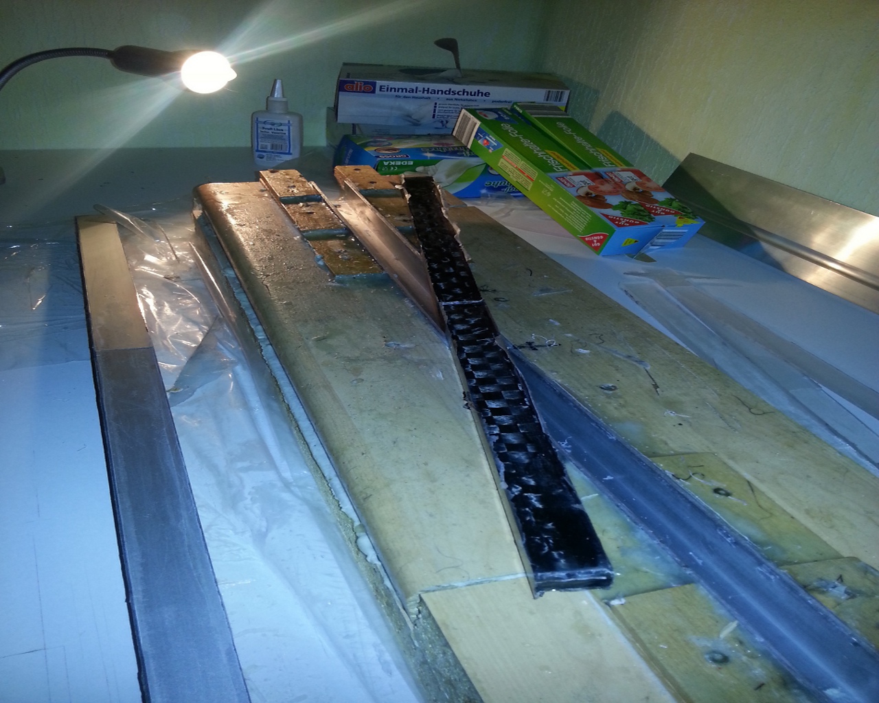 Die Flächen kommen von FFB den Stephan mir angeraten hat. Vollflächig mit 140er CFK und Kiefernholm.