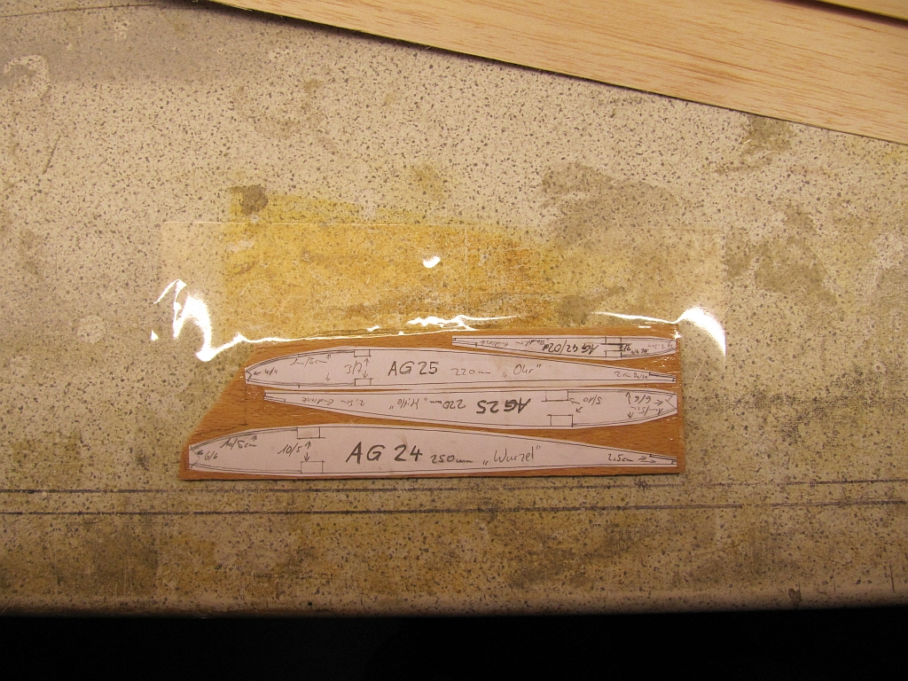 Mach ich, wobei ich beim Rumpf einfach nur die Seiteteile einer Ur-Libelle abgenommen habe, das ein bissl gestreckt und in der Höhe soweit reduziert, daß vorne der Eneloop gerade noch passt. Die Rippenabstände werden 5cm betragen, Rippenlänge ergibt sich aus den Schleifrippen :wink: , also an der Wurzel 25cm, Knick 22cm, Randbogen 12,5cm. Die Nasenleiste reduziert das ganze um im Mittelteil ein 6x6er Kiefernstäble, an den Ohren ein 4x4er und die Endleiste ist Balsa gestuft im Mittelteil aus 2st 1mm x 2,5xm und an den Ohren 2st 1mm x 2cm. Ich mach davon aber noch Detailaufnahmen, ist am einfachsten mit Bildchen zu erklären...