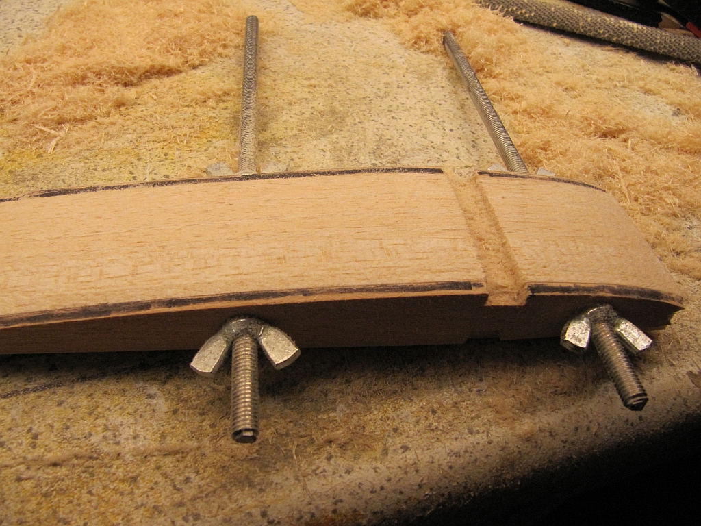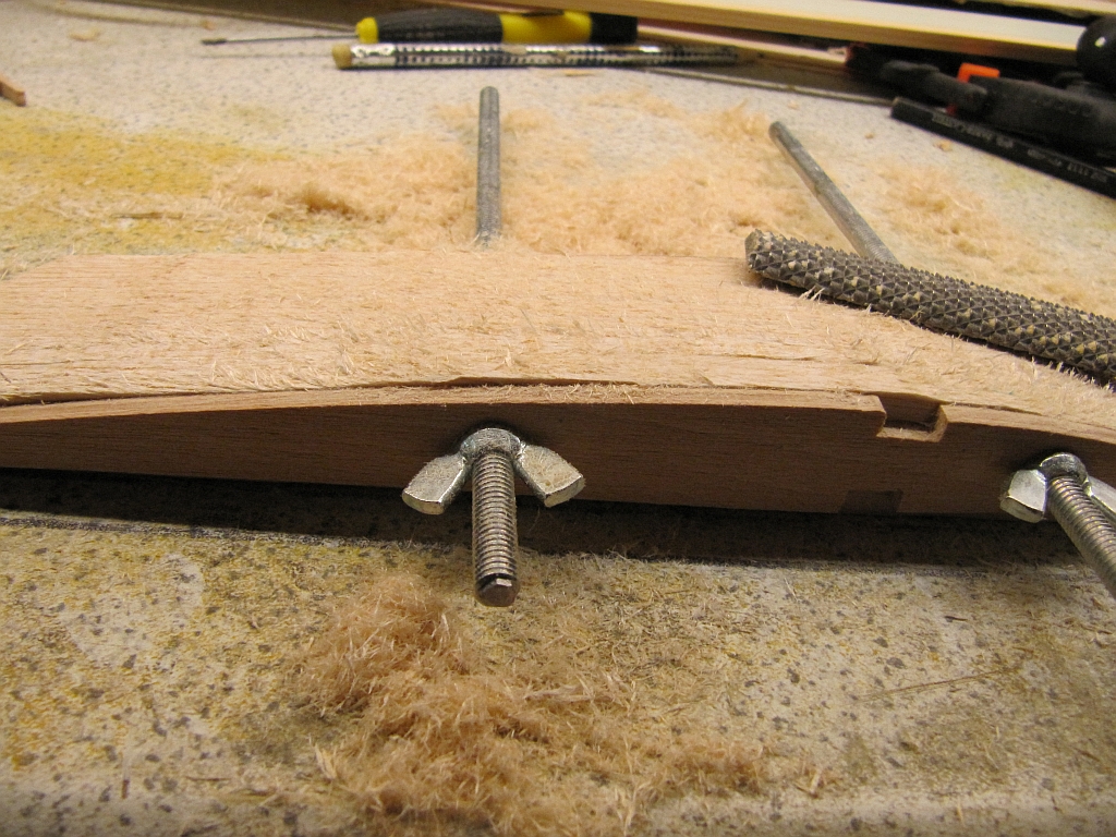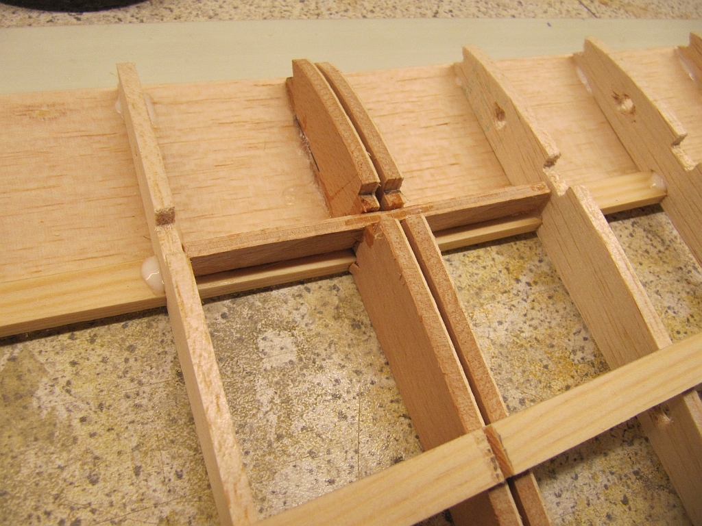 An beiden Ohren ist der untere Holm und die Beplankung festgeklebt, am Mittelteil ist der obere Holm inkl. den Stegen verklebt. Das HR muss noch verschliffen werden.