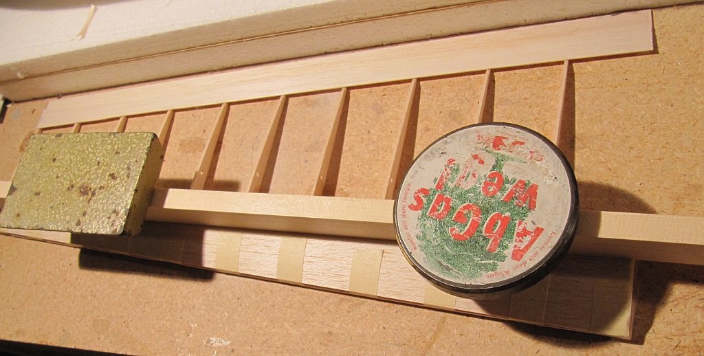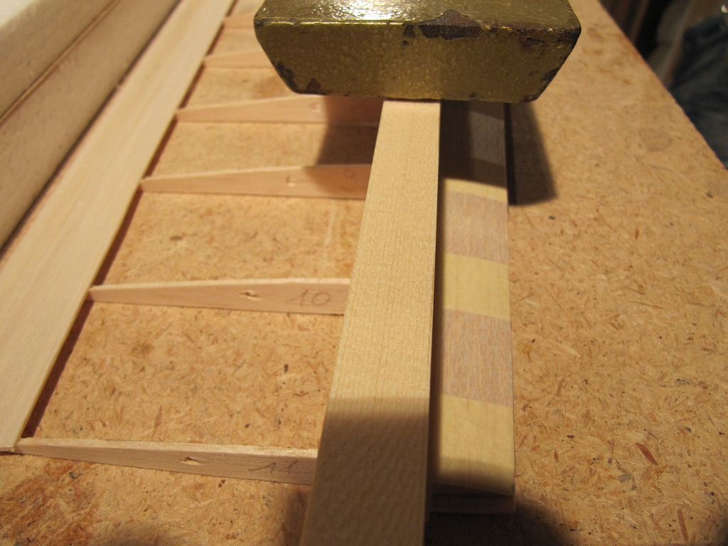Dann die Beplankung auf Maß bringen, mit einem Streifen Tesa mit dem Holm verbinden, rechtwinklige Striche im Abstand von 5cm machen, Leim nur auf den Holm aufgeben, die Beplankung nur an der Kante mit dem Holm verkleben und etwas Leim auf den Holm geben, die Rippen sorgfältig ausrichten, oberen Holm nur auflegen, noch nicht verkleben und alles beschweren. Die Beplankung wird erst später mit einem Trick mit den Rippen verklebt. :wink:
