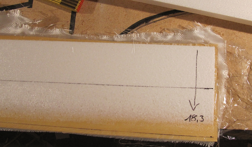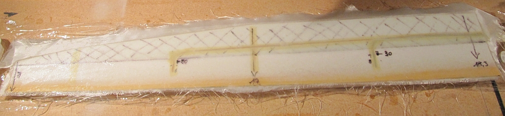 D-Box-Bereich mit 45° Gelege, vollflächig mit 166er unterlegt und Holm aus 3st. 220g/20mm Uniband-Stückchen, Harzverbrauch pro Hälfte 100g ohne zu sparen.