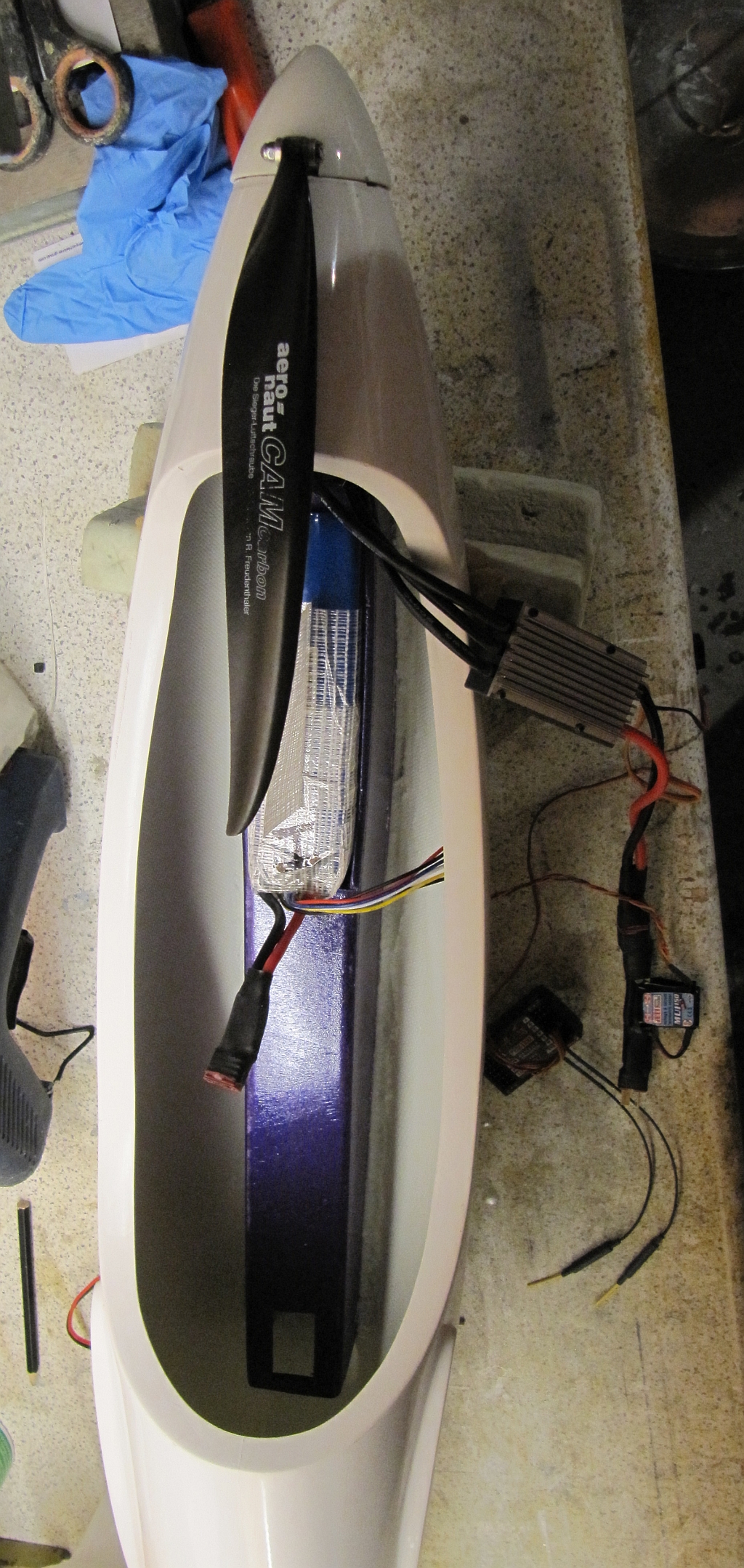 Motor ist ein C-5055-320 Turnigy für 23€, Regler ein Turnigy ESC 85Aw mit 5A BEC für 35€, Akku ein 5S-5000mAh 20C Zippy für 36€ an einer Aeronaut Cam Carbon 18/11 und einem HM-Spinner. Vorhin bei einem ersten Vollgastest kamen etwa 150W/Kg raus, passt also an sich ganz gut, ich werde aber nach einer ausführlichen Telefonberatung mit meinem Stromer des blinden Vertrauens